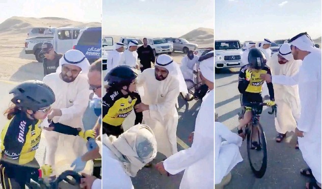 ٹویٹر پر شائع کی گئی ایک ویڈیو میں نائب صدر اور دبئی کے حکمران اماراتی سائیکلسٹ عنان العمری کو التھبہ ٹیم سے گرنے کے بعد ان کی مدد کرتے ہوئے دیکھے جاسکتے ہیں۔