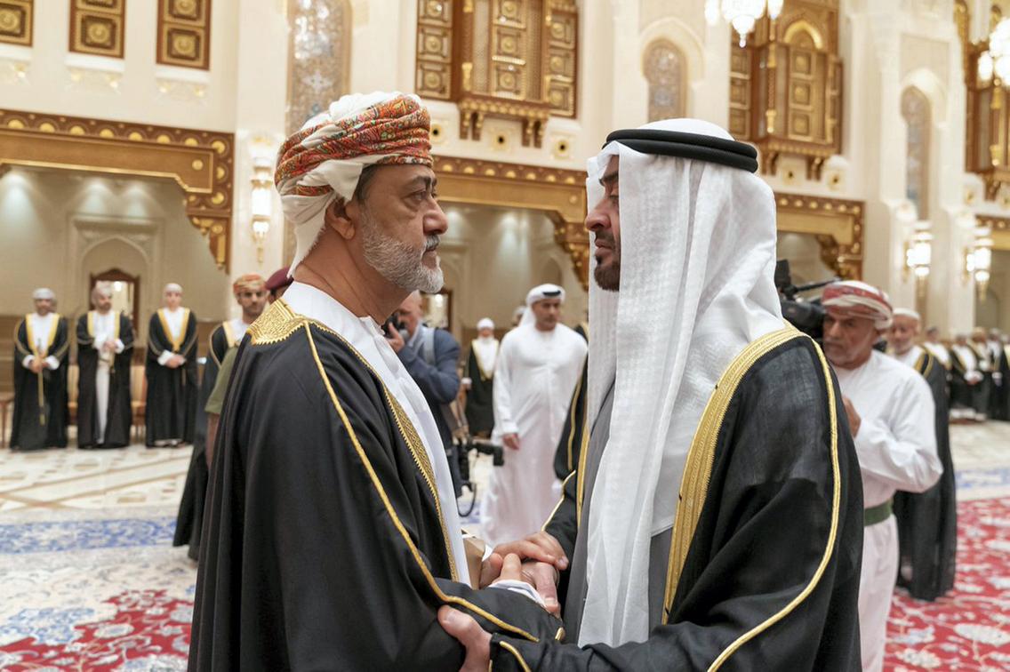 ہفتے کے روز تعزیتی پیغامات بھیجنے کے بعد ابوظہبی کے ولی عہد شہزادہ اور مسلح افواج کے نائب سپریم کمانڈر شیخ محمد بن زید نے اتوار کے روز سلطان قابوس کے جانشین سلطان ہیثم بن طارق سے ملاقات کی۔