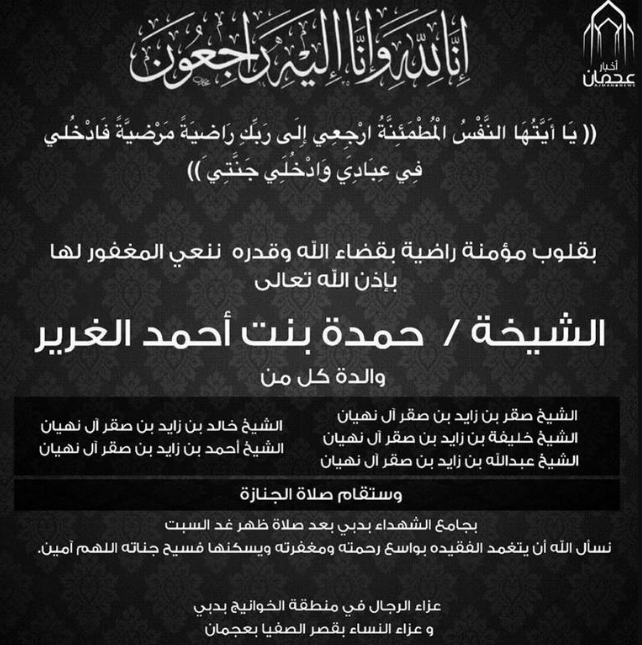 حکمران اجمان نے شیخہ ہمدہ بنت احمد الغوریر کی موت پر تعزیت کے لئے انکے اہل خانہ کا بھی دورہ کیا۔ ان کے ہمراہ اجمان کے ولی عہد شہزادہ شیخ عمار بن حمید النعمی اور شیخ حمید بھی تھے۔ انہوں نے اللہ سے دعا کی کہ وہ مرحومہ کی روح کو سکون عطا کرے اور لواحقین کو صبر جمیل عطا کرے۔ نماز جنازہ میں راس الخیمہ کے ولی عہد شہزادہ شیخ محمد بن سعود ال قاسمی بھی بڑی تعداد میں شیخوں اور اعلی عہدیداروں کے ساتھ موجود تھے۔